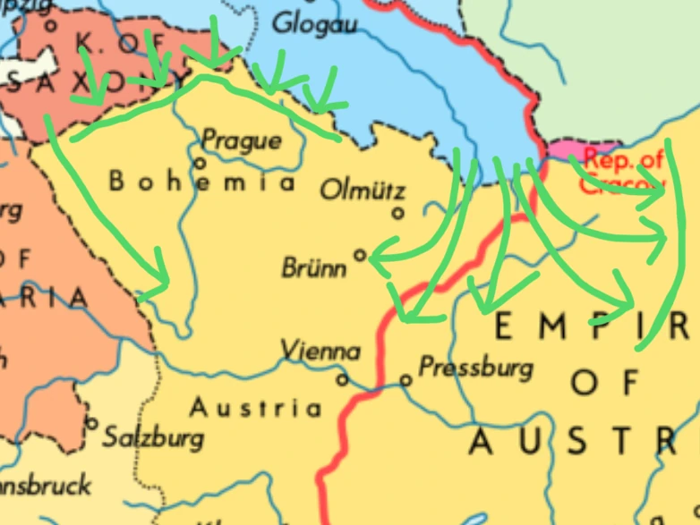 -Rather than directly invading Austria, we divide our forces into three groups. The first group will slowly move along the Austrian-Bavarian border and maintain a mainly defensive position. Their goal is to slowly encircle Bohemia.