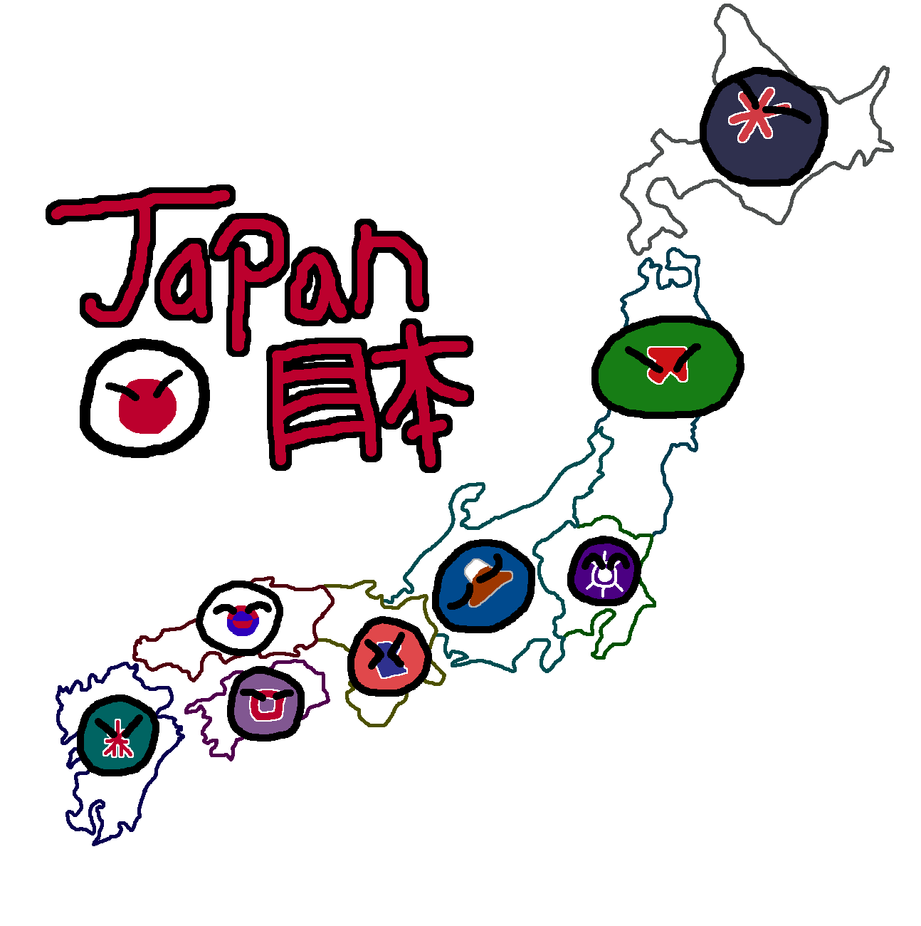 Hokkaidō, also a prefectureball, Honshū, Kyūshū, and Shikoku. Honshū can be divided into the regionballs of Tōhoku, Kantō, Chūbu, Kansai, Chūgoku, which along with the other islands adds to a total of 8 regionballs. Japanball is divided into 47 prefectureballs, consisting of 2 urban prefectureballs, 1 territoryball, 1 metropolisball (his capitalball